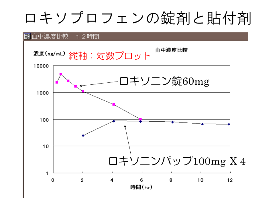 図3.ロキソプロフェンNaの錠剤と貼付剤の血中濃度比較