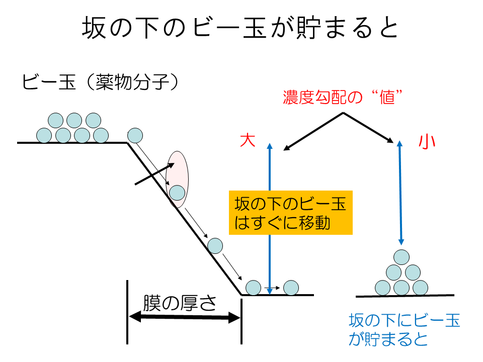 坂の下に薬物分子が留まっていれば,坂の上と下との分子数の差である濃度勾配は減少します.となると,流束は小さくなり薬物移動量である吸収量は時間と共に低下します.それでは製剤からの放出速度を一定にすることは困難です.