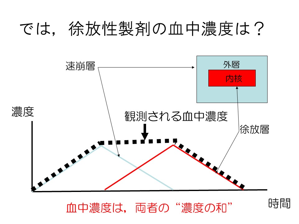このグラフは添付文書にも記載されており,外層と内核の2つの部分が存在していることがわかりやすい例です(専門的になりますが,血中濃度は複数例の”平均値”なので一人一人のデータを見ると若干異なるイメージになります).