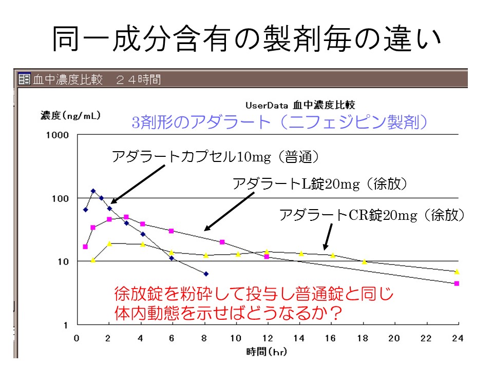 もちろん粉砕したからといって完全に徐放性が失われるとは考えられませんが,粉砕により普通錠に近い特性,つまりアダラートカプセルの特性に近くなると考えられます.そうすると,アダラートカプセルのグラフが2倍弱高くなったグラフを描くと想定できますね.そうなると,想定以上の血圧低下を起こすでしょう.このように,